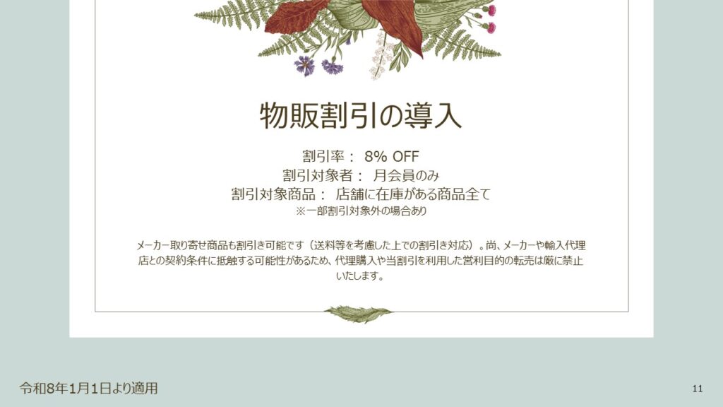 末筆になりますが、皆様に当店に通う価値をさらに感じていただけるよう、会員向けサービスの拡充や良質な空間づくりに邁進してまいりますので、至らない点もあるかと思いますが、今後とも変わらぬご愛顧のほどどうかよろしくお願いいたします。