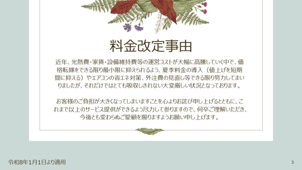 ここまでご確認いただき有難うございます。値上げに関しては本当に心苦しい限りです。今年の4月から店舗の家賃が上がり、光熱費は実績ベースで例年の1.7倍程度まで高騰しております。