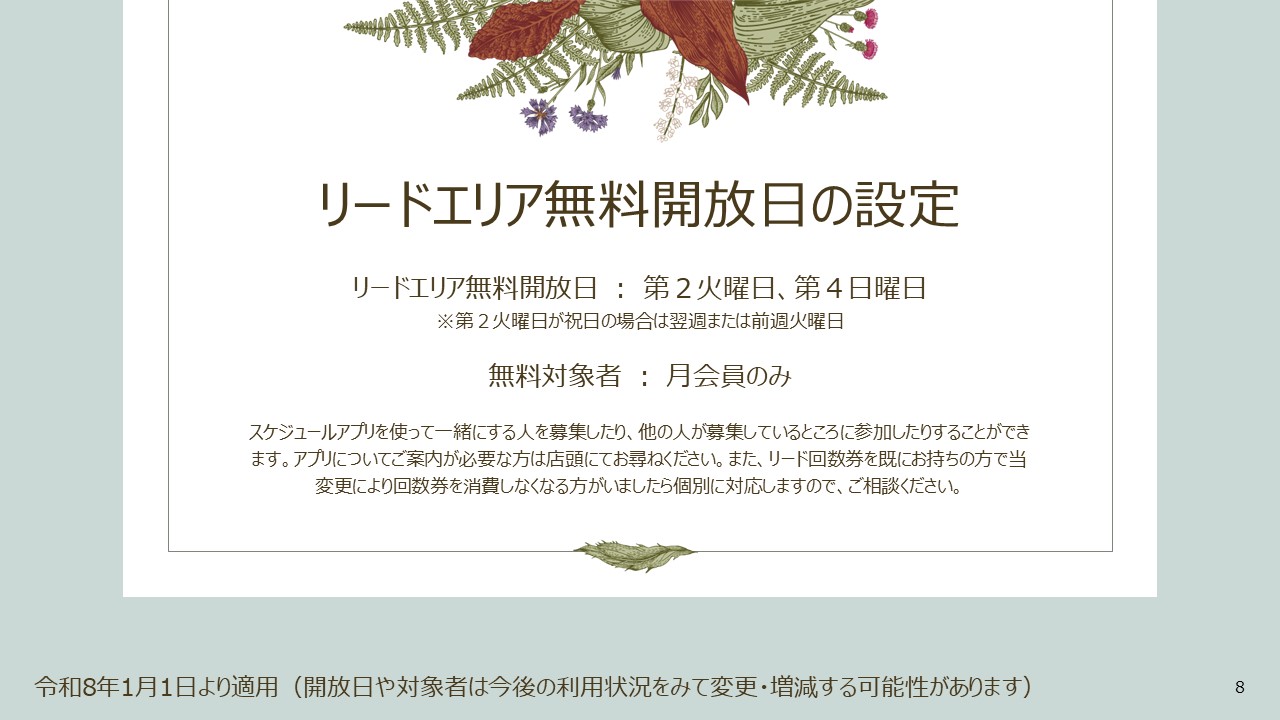 尚、月会員の更新を適用日以前(12月最終営業日まで)に行った場合は、有効期限にかかわらず現行料金での更新となりますので、お得に更新していただけます。またその場合も、リード無料開放日のリード利用や物販割引き等ご利用いただけるサービスは変わりませんのでご安心ください。