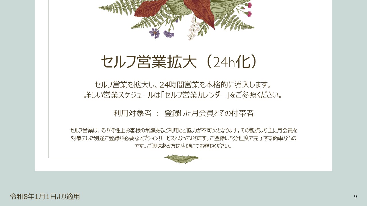末筆になりますが、皆様に当店に通う価値をさらに感じていただけるよう、会員向けサービスの拡充や良質な空間づくりに邁進してまいりますので、至らない点もあるかと思いますが、今後とも変わらぬご愛顧のほどどうかよろしくお願いいたします。
